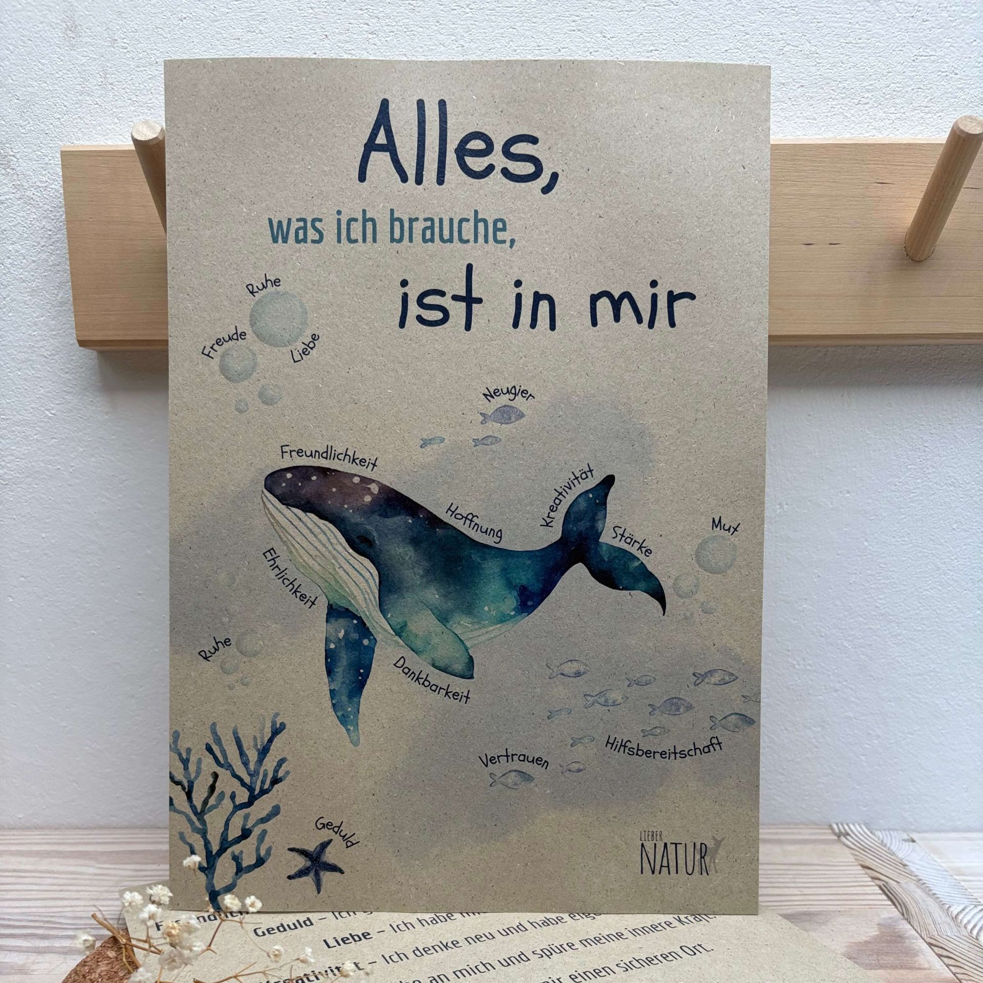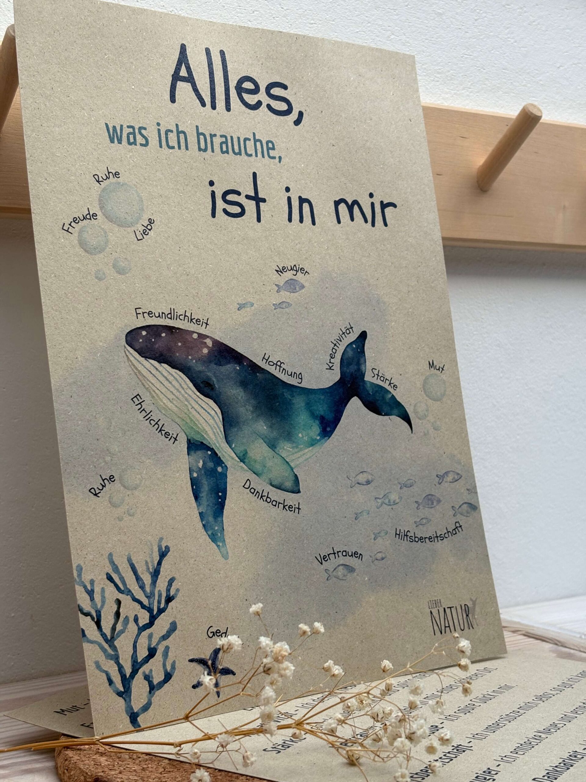 • „Alles, was ich brauche, ist in mir“, liebevoll illustriert mit unserem beliebten Wal